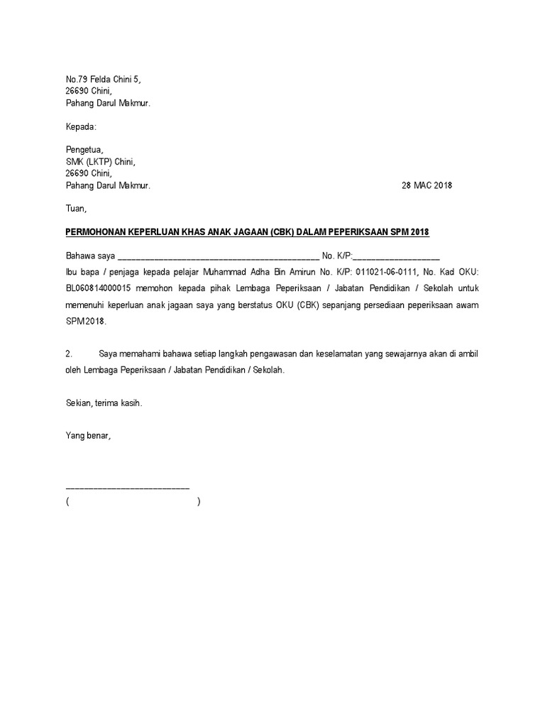 Surat Permohonan Penjaga Cbk 2018 Pdf